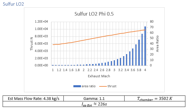 Lunar regolith is a fine jagged dust with only the faintest of traces of hydrogen and carbon[5], elements critical to human life. What regolith has in true abundance is oxygen, silicon, and metallic elements. To that end NASA Glenn Research Center’s Chemical Equilibrium with Applications (CEA) was used to investigate fuel chemistries might be able to provide lift. Beyond silicon and metallic elements, sulfur was added for consideration after finding reference to brimstone rockets during research. While sulfur makes up less than 0.2% of lunar regolith by mass, its ability to operate as a liquid at reasonable storage temperatures made it worth considering.