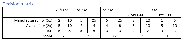 Aluminum, sulfur, potassium, all show potential as plentiful fuel sources. Two additional options that will be considered are a “simple” cold gas thruster and a thermally enhanced “cold gas” oxygen engine.