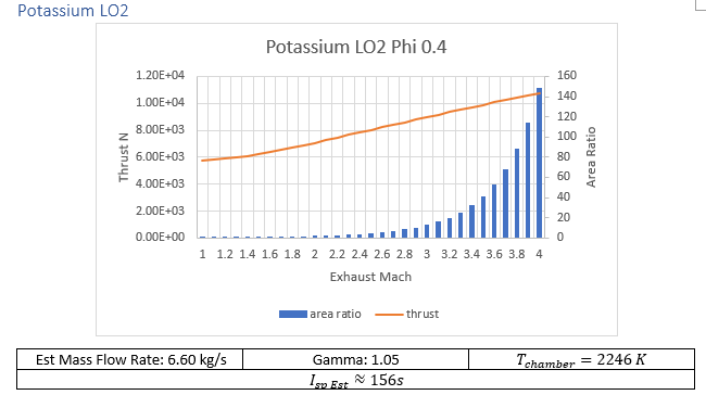 Given the requirements outlined above the so-called brimstone rocket lost out to potassium/liquid oxygen. While sulfur oxygen reaction gives an additional 50% ISP over potassium oxidizing, the increased chemical availability of potassium gives it higher interest. At time of writing the only mention that the author was able to find associated with using potassium as a propellant for ISRU applications was an entry in Lunarpedia. In the entry liquid sodium potassium eutectic mixture be used. Due to time constraints robust calculations of this mixture will need to wait until a later date.