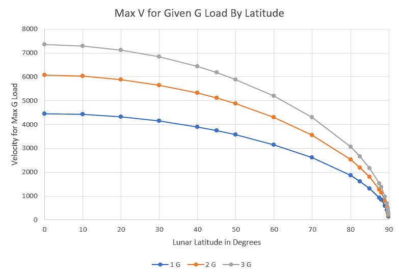 A chart showing the maximum velocity a vehicle could achieve for a given maximum load condition based on the lunar latitude in degrees.